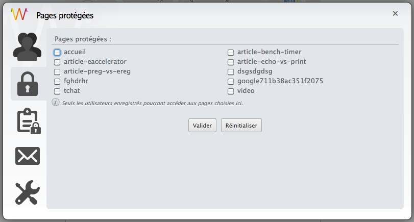 L’étape suivante consiste à choisir les pages auxquelles vous allez restreindre l’accès. Une fois ces pages choisies, tout visiteur tentant d’y accéder s’y verra refuser l’accès et verra à la place une invitation à se connecter au site. Cochez simplement les pages à protéger et validez le formulaire.